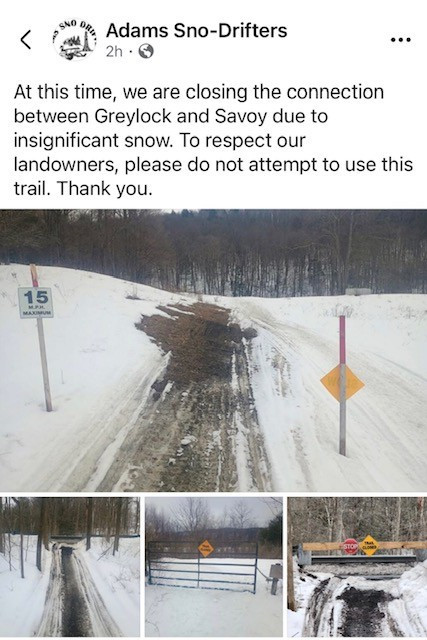 At this time, we are closing the connection between Greylock and Savoy due to insignificant snow. To respect our landowners, please do not attempt to use this trail.